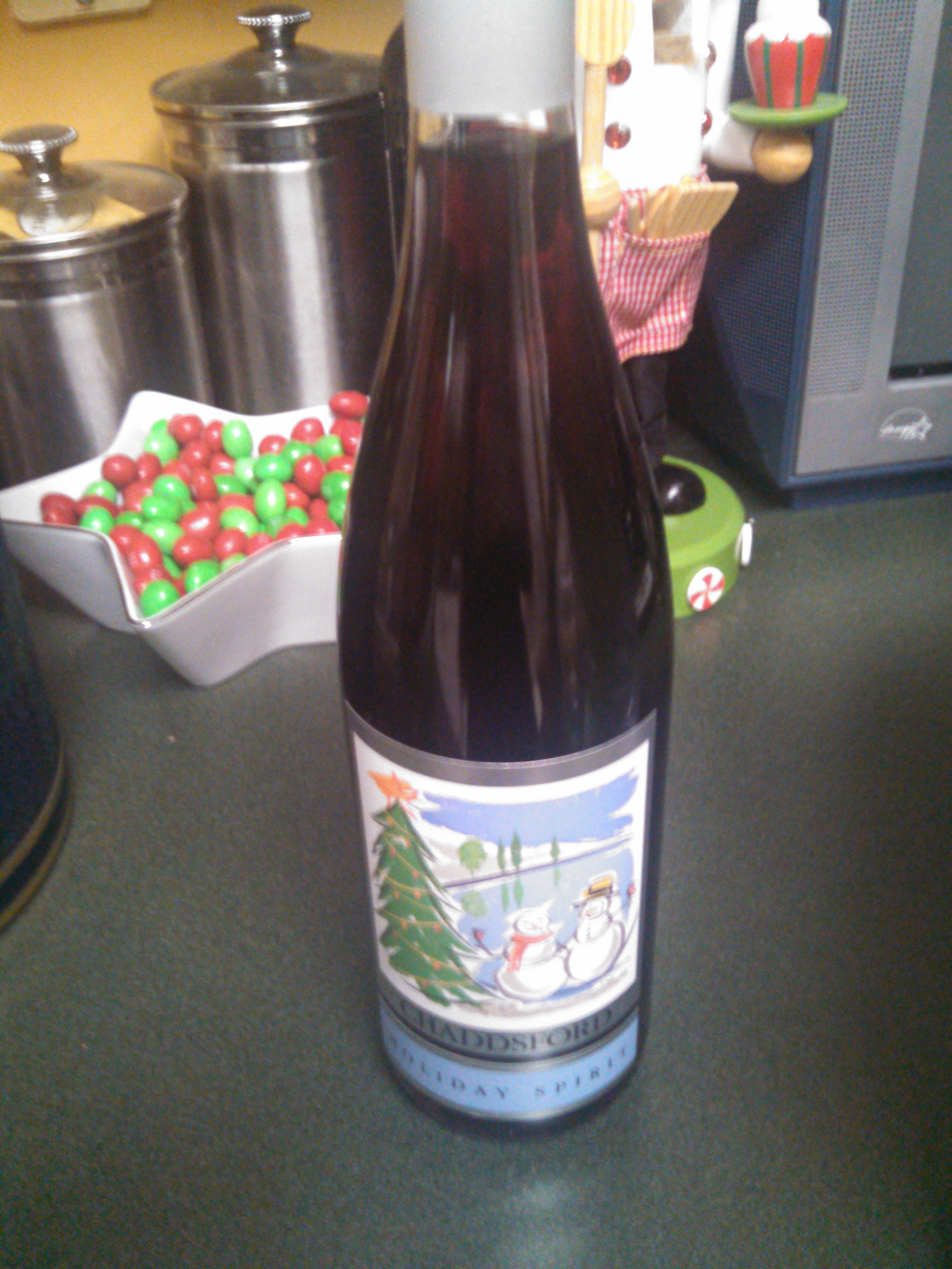 Merry Christmas Eve. Happy Holidays to you and your loved ones, in whatever you celebrate. Here is such a charming wine I found around this time last year, poking around various wine shops around town. The Chaddsford Winery Holiday Spirit bottle sold me on the label alone. We have a happy Snow Couple enjoying the holidays and having fun. This is what life is all about, not just during Christmastime, but all twelve months of the year.